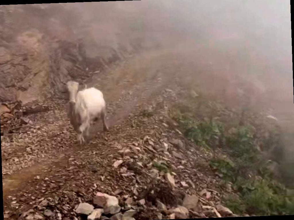 Группа туристов столкнулась с дикой коровой на узкой каменистой тропе. Животное было очень энергичным и стремительно приближалось к ним, не отрывая глаз от камеры, снимавшей происходящее.