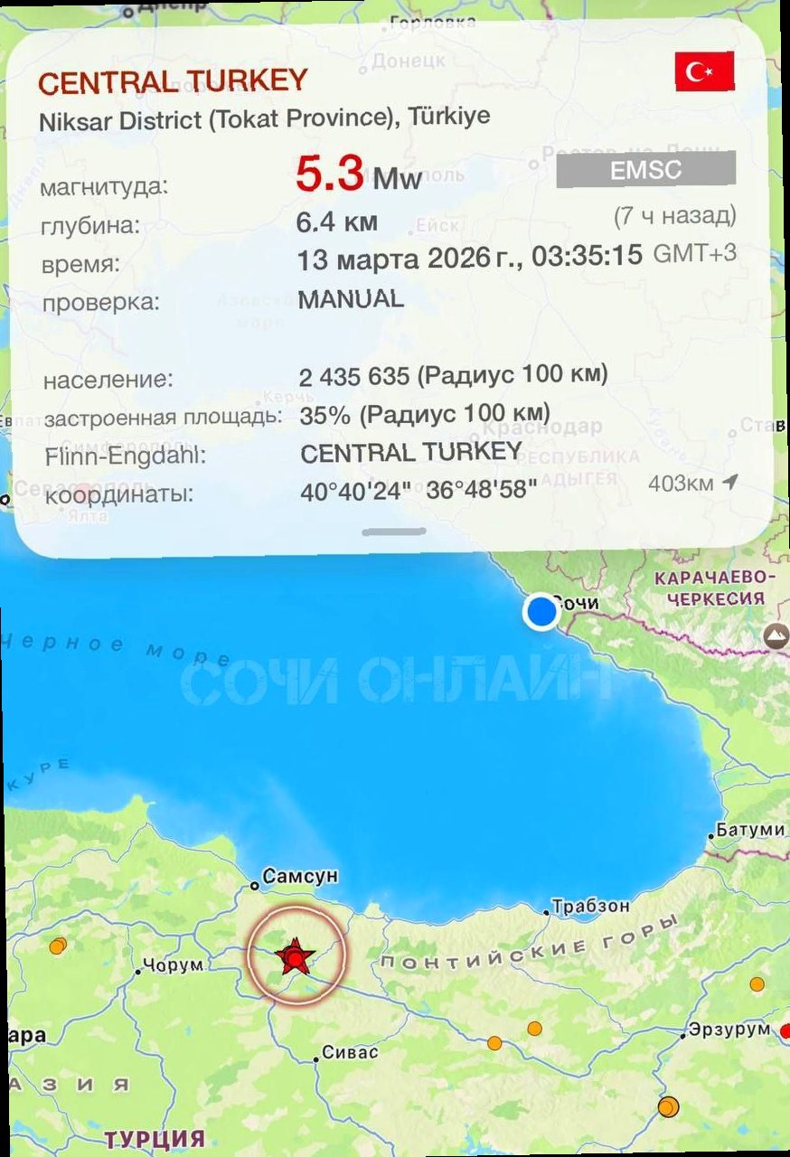 Ночью жители курортного города Сочи сообщили об ощущаемых подземных толчках — некоторые горожане даже проснулись от колебаний. По данным Европейско-средиземноморского сейсмологического центра, землетрясение произошло в 03:35, однако его эпицентр располагался в Турции — между городами Самсун и Сивас. Магнитуда землетрясения составила 5,3, а очаг залегал на глубине около 10 километров. Расстояние от эпицентра до Сочи — примерно 350 километров, поэтому в курортном городе были зафиксированы лишь слабые колебания силой около 2 баллов. Фото: Европейско-средиземноморский сейсмологический центр